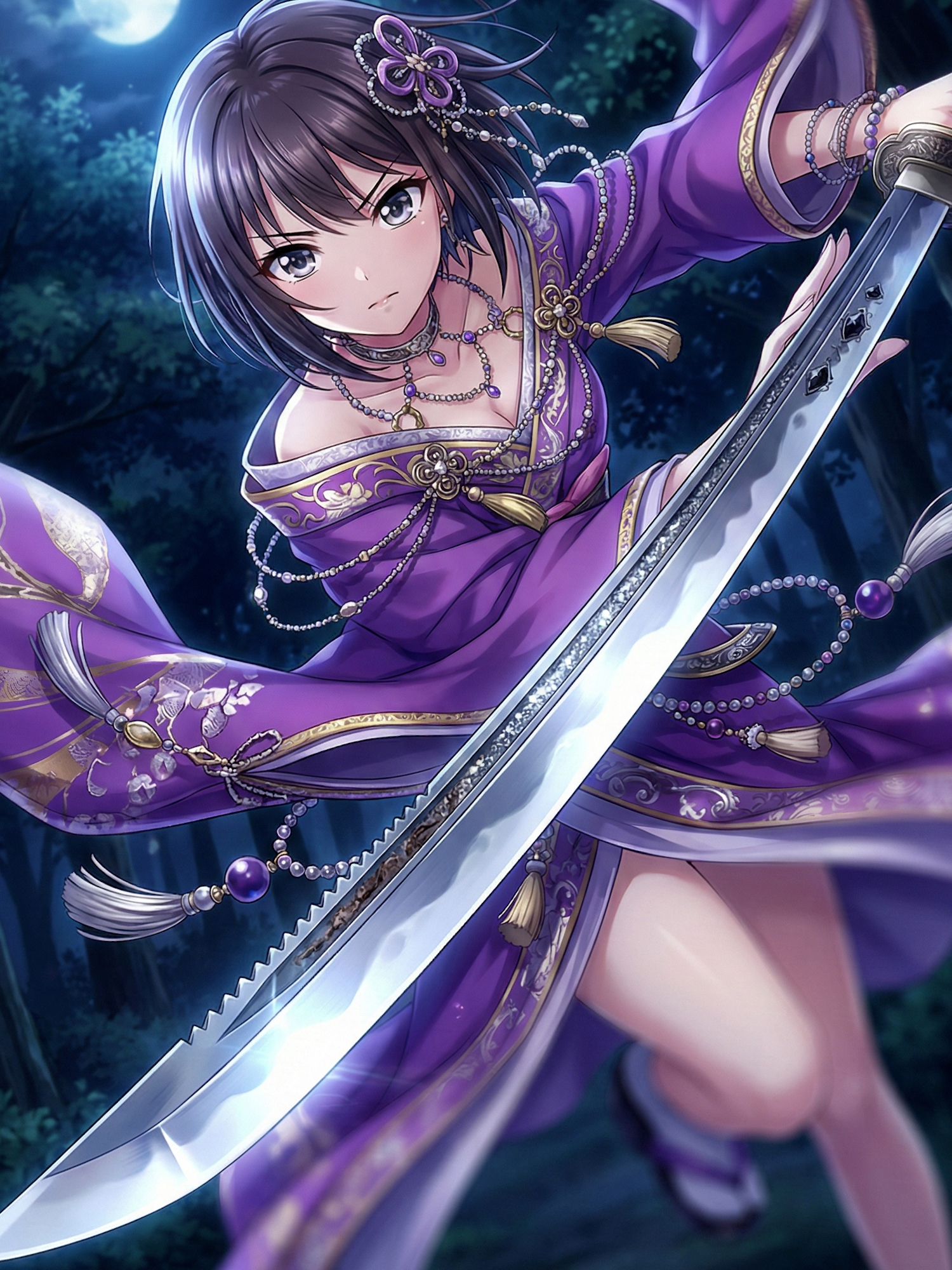 The yōtō in her hand reflects sanctity corrupted. It gleams on the surface, yet faint cracks pulse with dull red light beneath the metal, as if the weapon itself resists its own form. Every movement emits a faint sound like scratching — not aggression, but decay in motion. Around her, scattered fragments of sutra papers drift like ash, words eroded into unreadable dust.