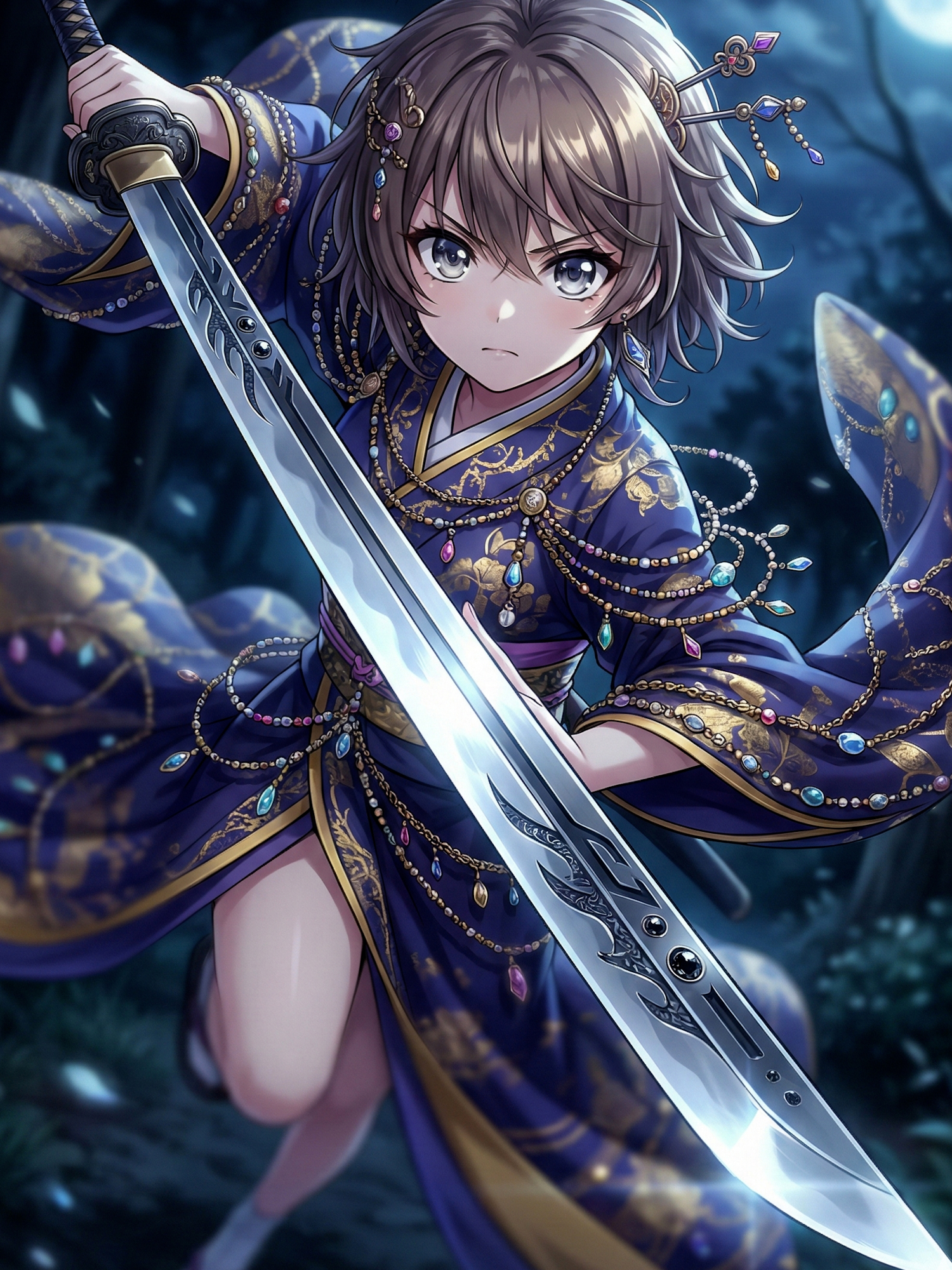 Her yōtō takes the form of an immense, blunt-edged weapon — more hammer than sword — its spine lined with fragments of bone and coral. When lifted, it seems to distort gravity itself. Every swing carries an echo of breaking structures and collapsing cliffs. Around her, the landscape bends under unseen pressure; air thickens, sound slows. The scene feels like the moment just before impact — an eternal, suspended heartbeat before annihilation.