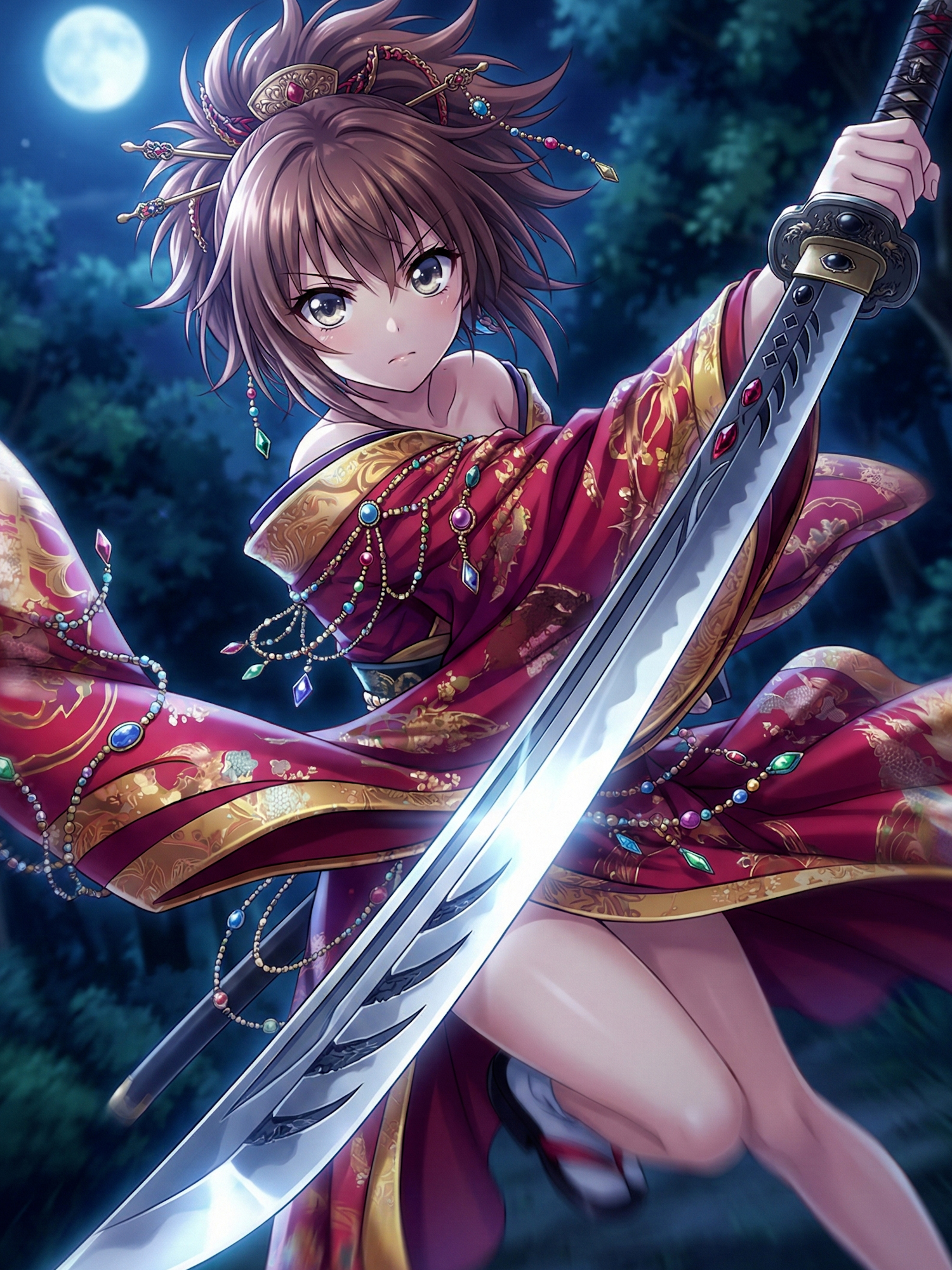 The yōtō in their hand is a weapon carved from emotion itself. Its blade is veined with restless energy, faint arcs of luminescence tracing patterns of movement that never cease. Each swing leaves behind a brief echo of light — not fire, but remembrance. The sword does not thirst for blood; it seeks release. Around them, the battlefield dissolves into abstraction — a landscape made of echoes, the residue of every emotion that could not find peace.
