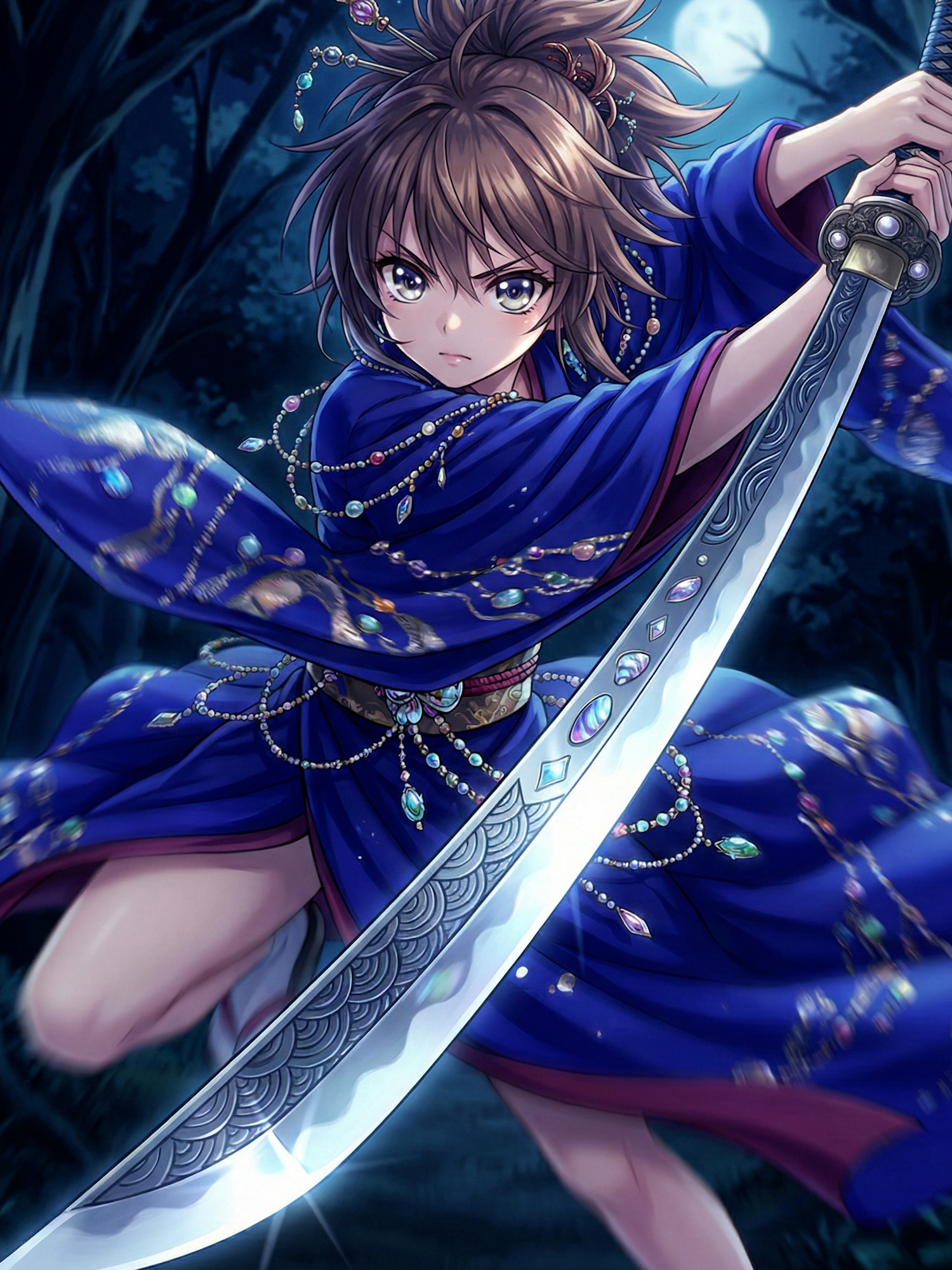 The yōtō she carries is unlike those of wrathful spirits or vengeful deities. Its blade ripples like liquid glass, each motion refracting faint blues and greens. Patterns of wave and fin are etched along its length, pulsing softly with bioluminescent glow. The weapon does not exist to strike; it exists to sanctify — to define the boundary where dread dissolves into faith. When drawn, its edge does not wound; it illuminates.