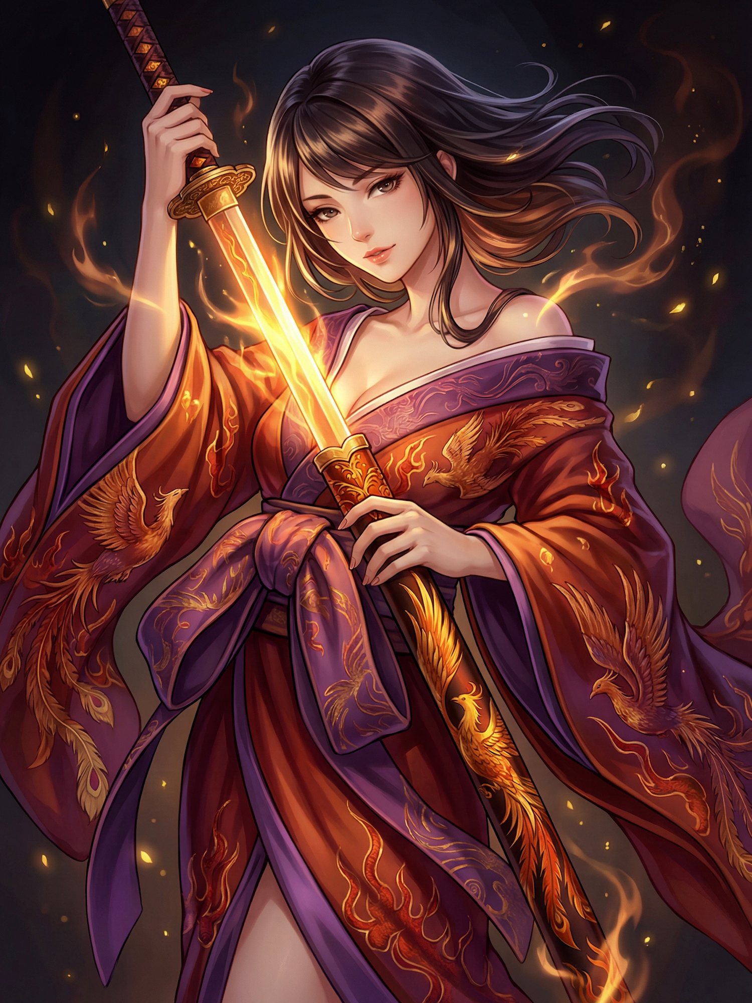 In this vision, the yōtō appears as a ceremonial blade resting within the bird’s plumage — its edge polished to mirror the sky. The sword’s surface refracts halos of faint gold, its form more symbolic than lethal. It represents the equilibrium of forces — a weapon that exists not to divide, but to define. When drawn, it does not blaze, but hums — a resonance that quiets rather than commands. The act of wielding it is meditation, not conquest.