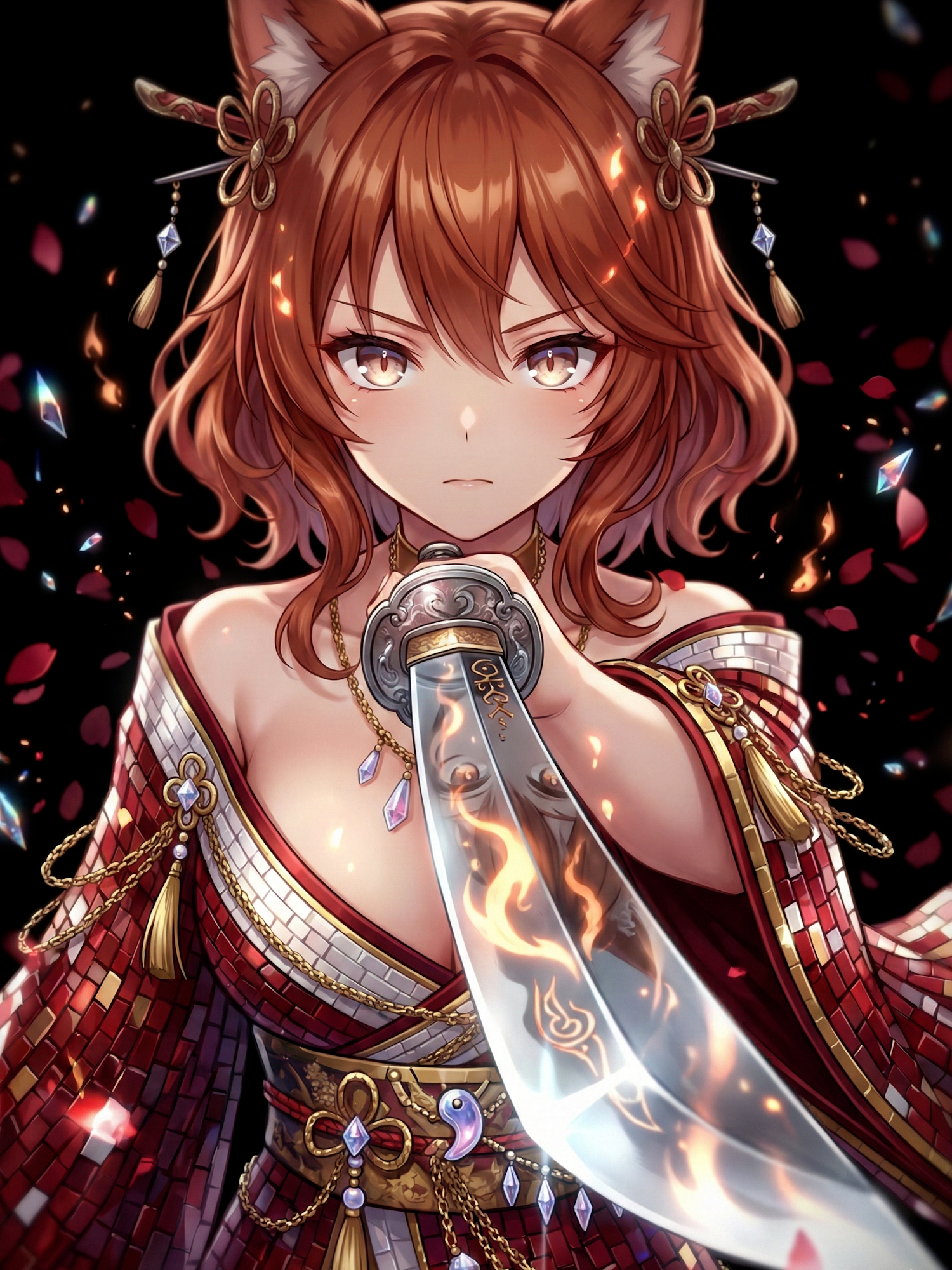 In some modern visual reinterpretations, kitsunetsuki no miko manifests as a yōtō — a blade engraved with ritual seals. The sword trembles between command and possession, embodying voice without autonomy.