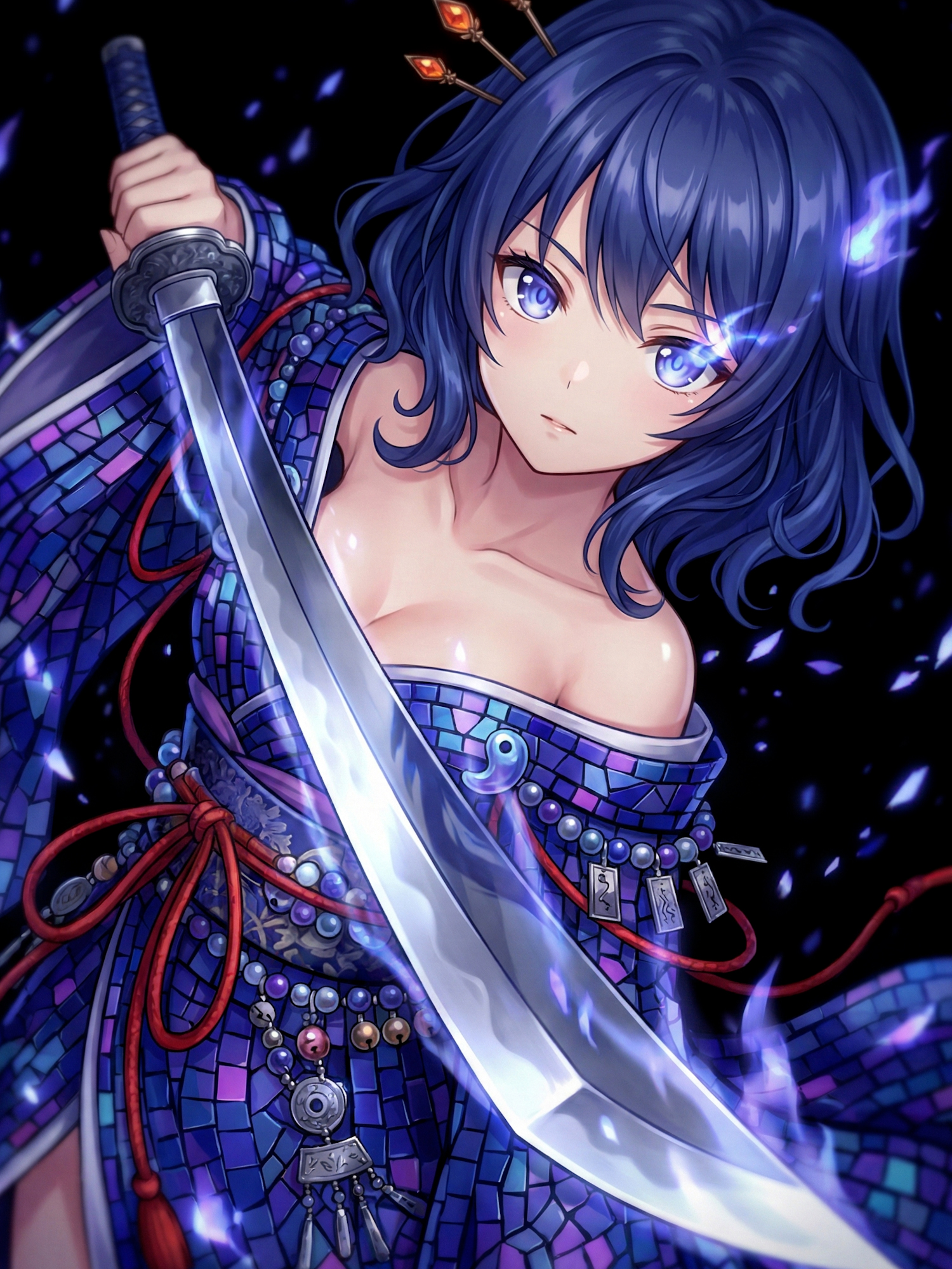 In some modern visual reinterpretations, Onibi no Musume manifests as a yōtō — a blade that glows with cool blue fire. The sword does not burn; it beckons, embodying invitation rather than force.
